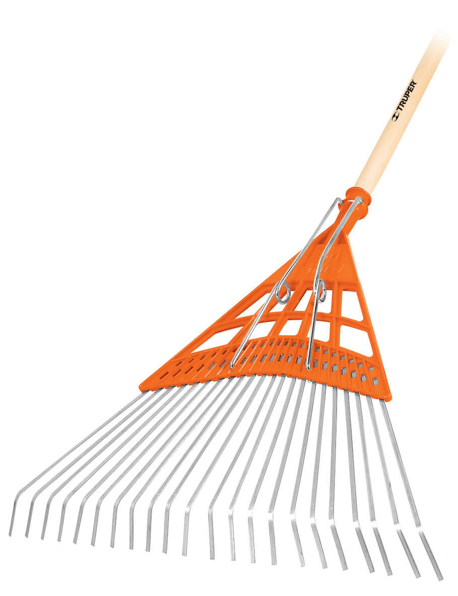 מטאטא דשא 20 שיניים ממתכת משולבת פלסטיק ובעל ידית מעץ.